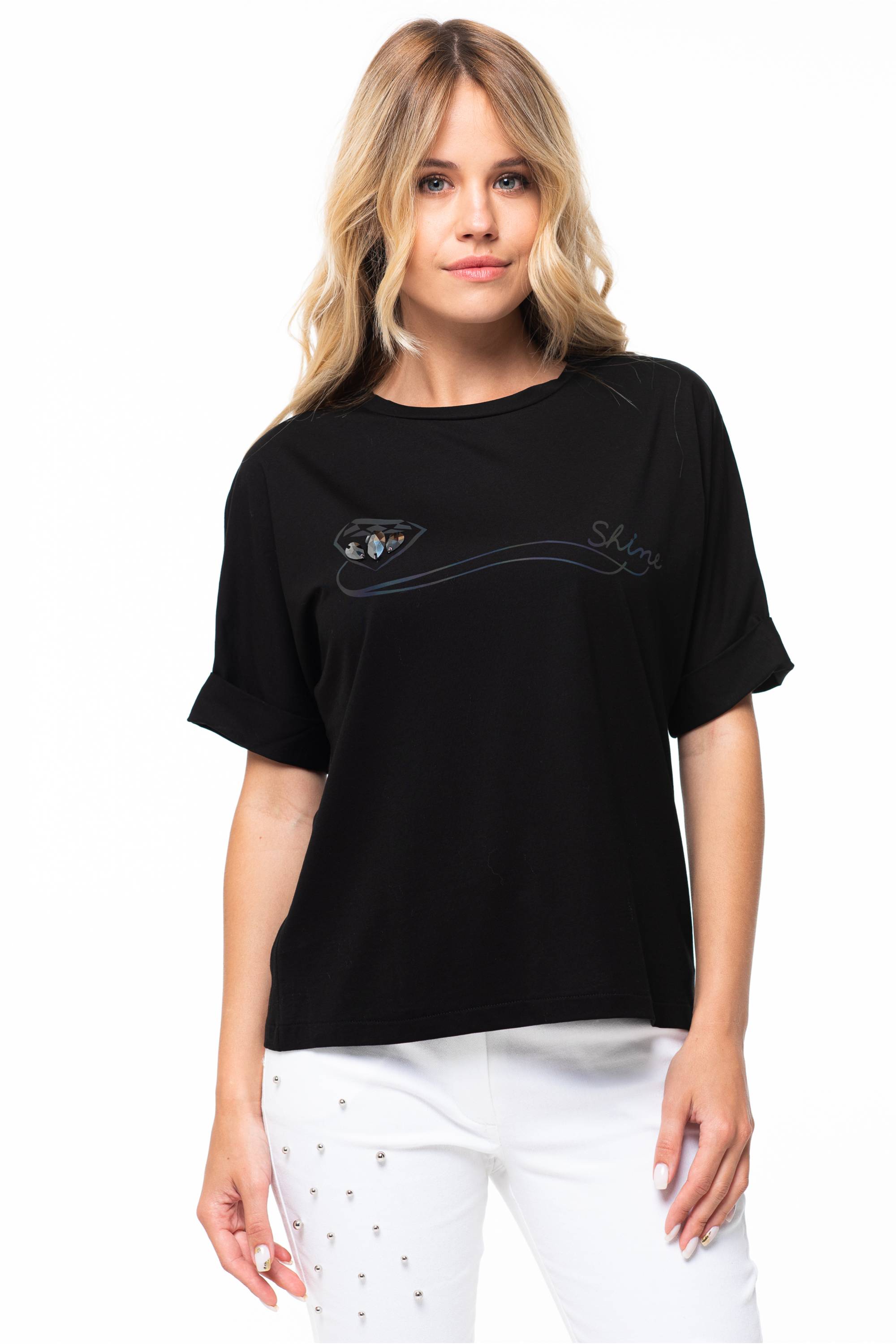 Футболка представлена универсальным размером S (44-48) и двумя расцветками: белой и черной. Изделие имеет декор «Светящийся принт и камни».