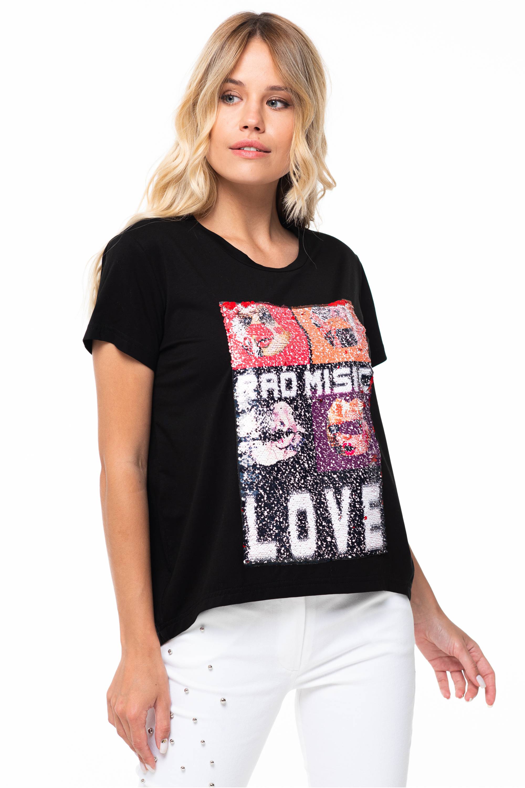 Стильная футболка свободного кроя с коротким рукавом и пайетками меняющими рисунок.