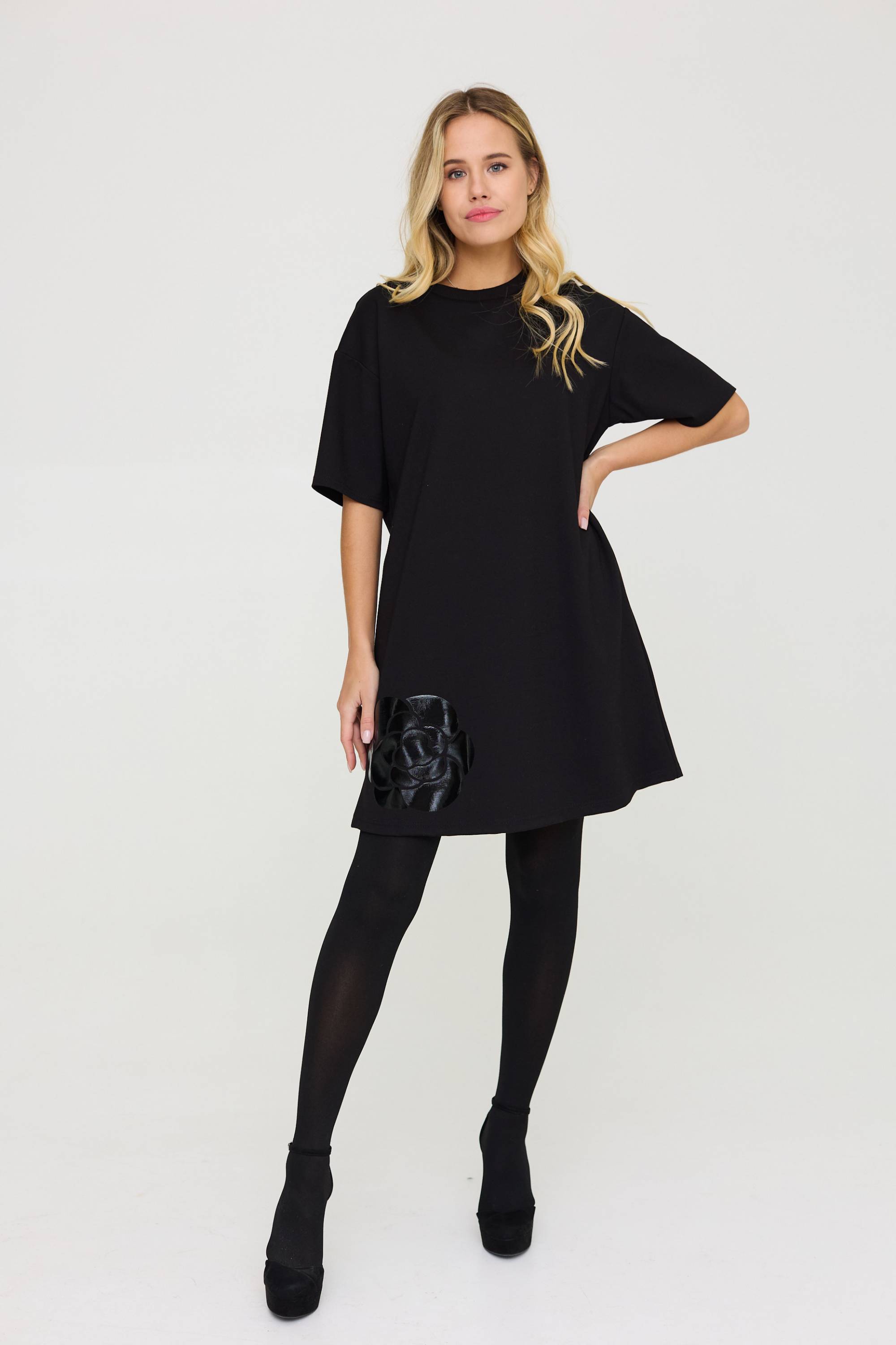 Сукня А- силуету в універсальному розмірі (one size) - відрізняється вишуканою простотою. Нічого зайвого! Тільки суворі, чисті лінії крою, глибокий чорний колір, щільна тканина і лакова аплікація.